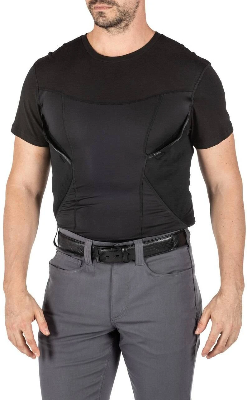 The 5.11 Tactical Cams Short Sleeve Baselayer Shirt is a great CCW alternative for those times when you don’t want to carry IWB or appendix-carry. The top of this baselayer looks like a typical t-shirt, making it perfect for wearing underneath a collared shirt. The upper body is made from a 4.1 oz. 60% cotton/40% polyester jersey and the a compression-fit lower body is made from 5.1 oz. 86% polyester/14% elastane jersey material. A body pocket on either side for firearm and/or accessories provides a quick, comfortable, extremely low visibility solution for a firearm in any sort of casual or off-duty environment. Integral odor control fabric and 4mm ultralite Ortholite padding will keep you comfortable while fighting odors of sustained activity.