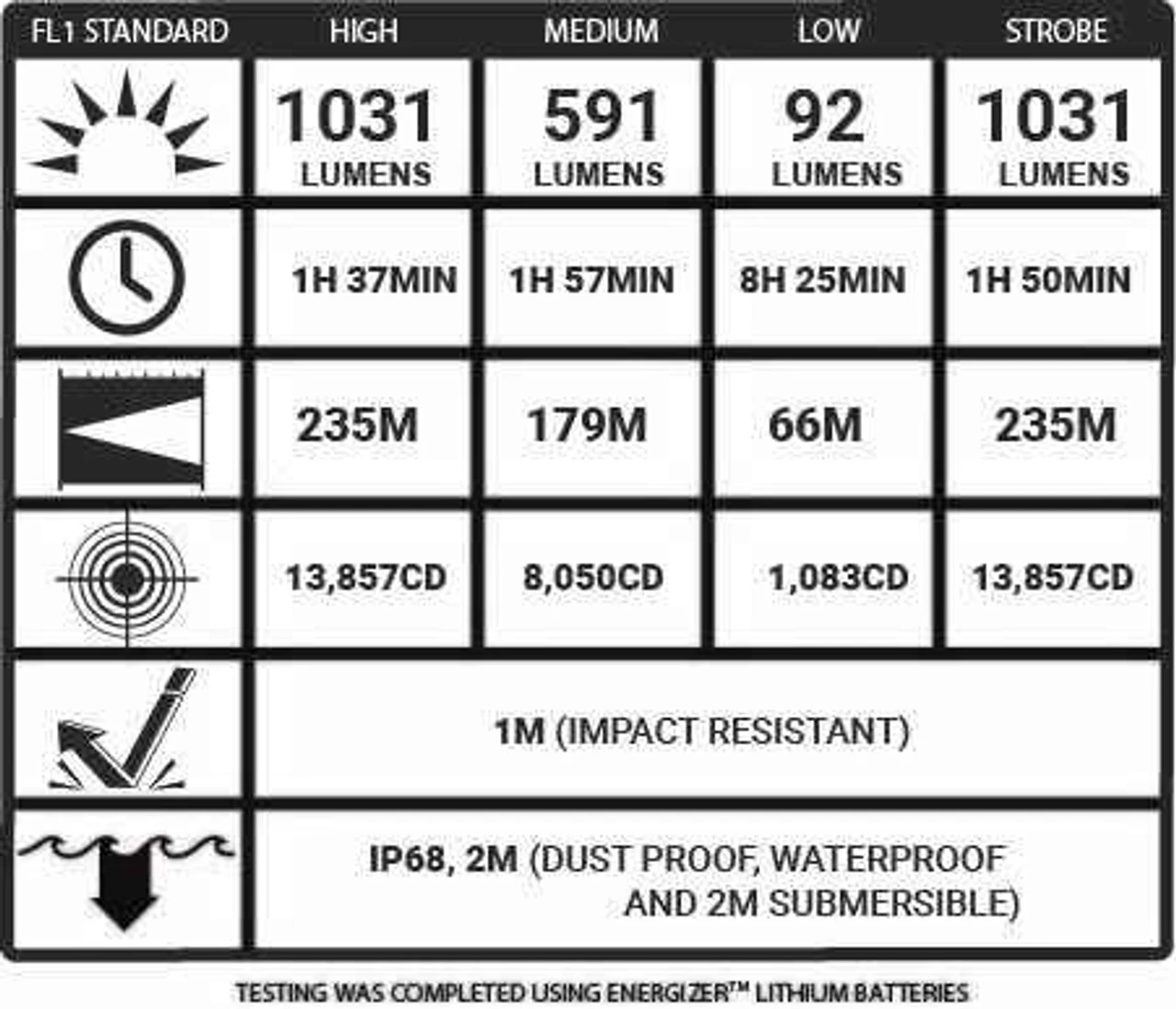 The 5.11 Tactical Response XR1 Flashlight has an output of 1031 lumens with a runtime of 1 hour 37 minutes. This flashlight is IP68 dust proof and water proof up to 2 meters. This duel fuel compatible light offers flexibility being able to run on disposable CR123 or 18650 rechargeable batteries. For serious duty, the Response XR1 dials up the toughness and reliability.