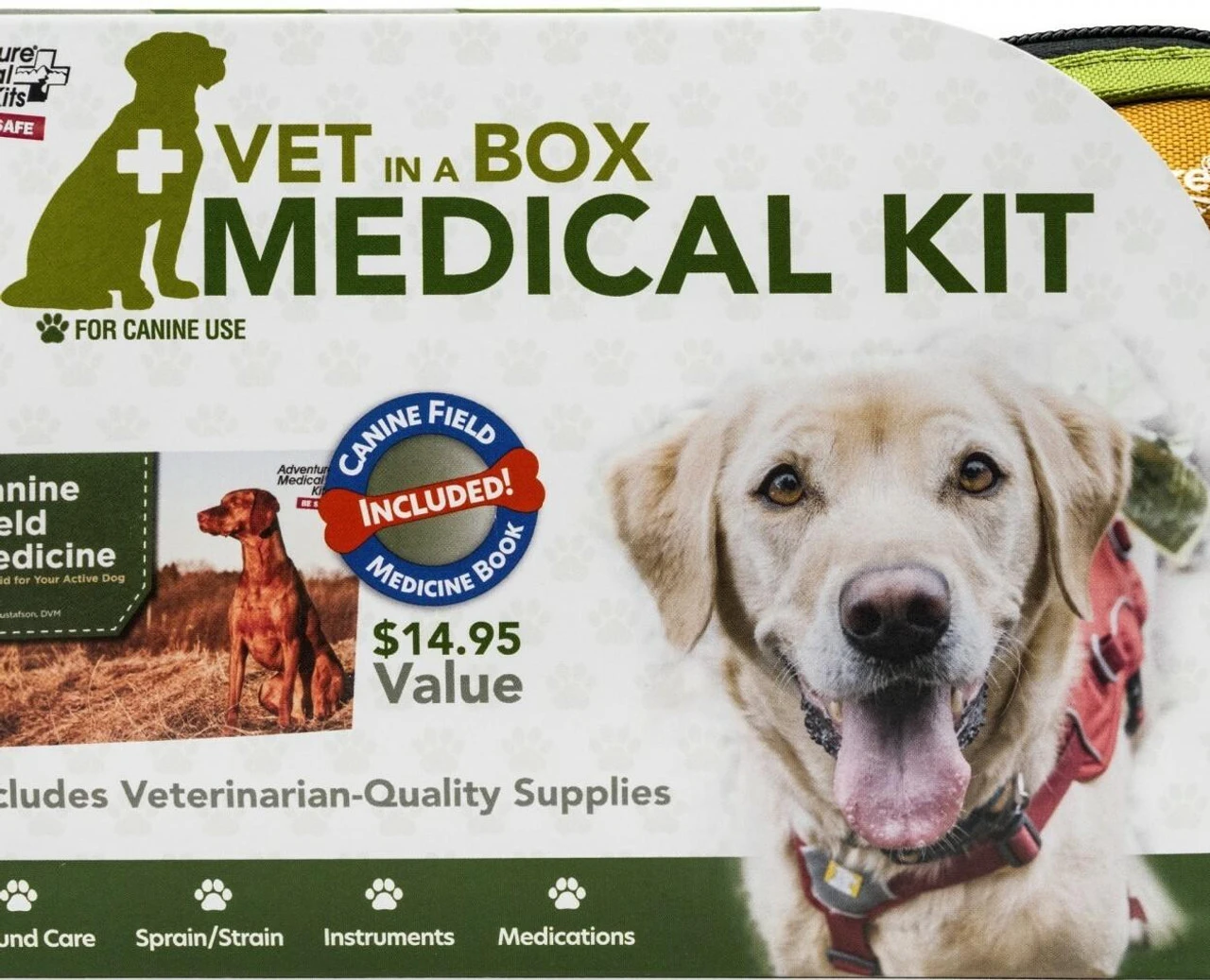 The Adventure Medical Kits Adventure Dog Vet-In-A-Box Medical Kit is a complete dog first aid kit that treats the 10 most common dog injuries (broken nails, accidental ingestions, sprains, serious cuts, porcupine quills, and more) when on the trail, in the field and at home. This canine emergency kit has a waterproof inner bag to keep the contents safe and is compact enough to fit in a hiking pack. The included Canine Field Medicine book by veterinarian Sid Gustafson, DVM, teaches you how to effectively use the dog kit to provide the best care.