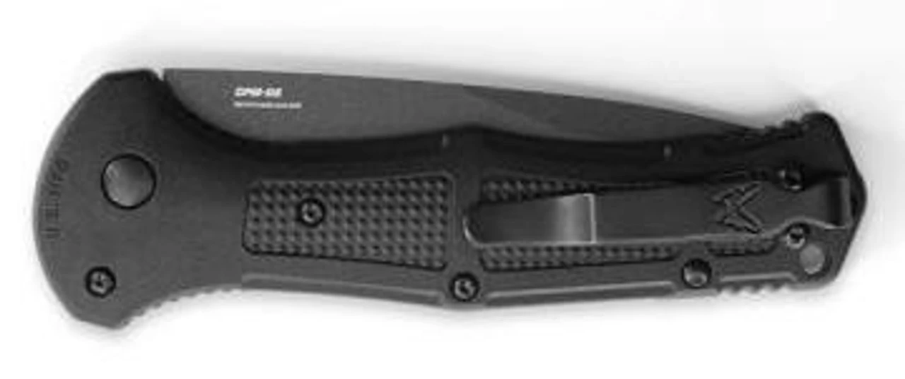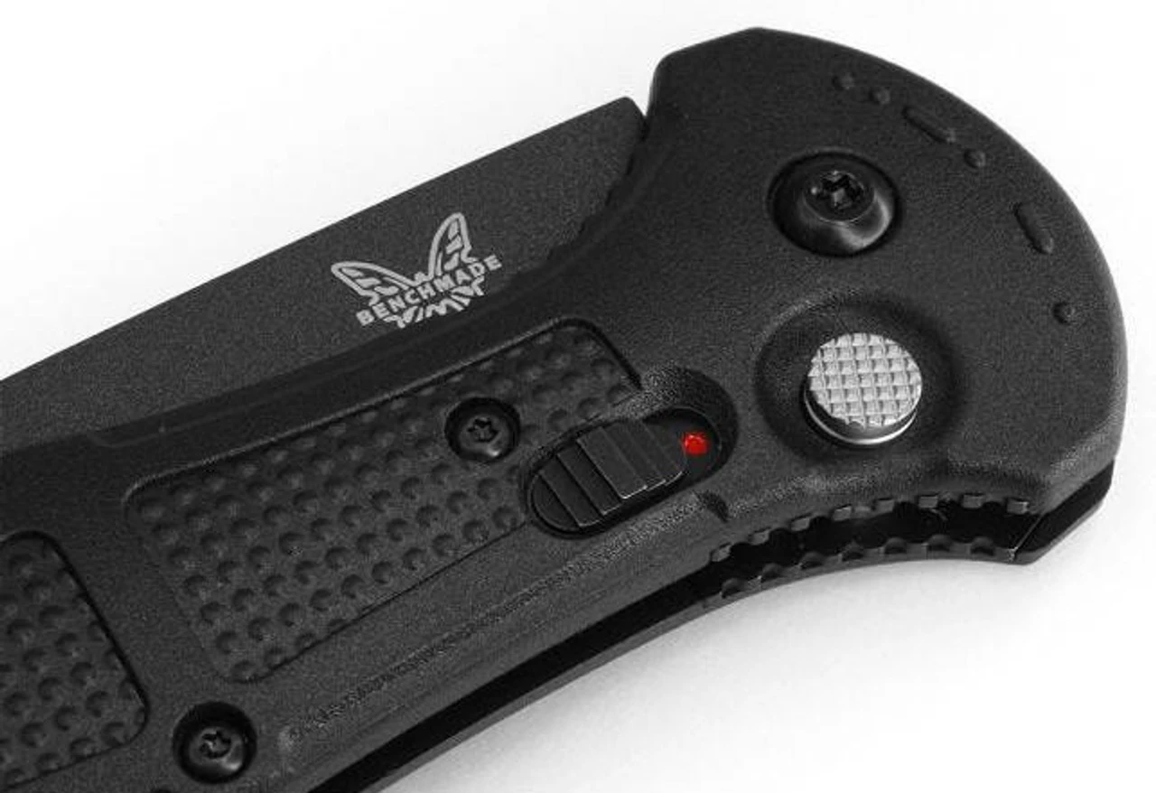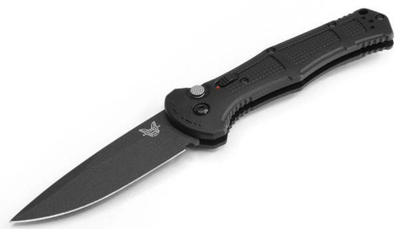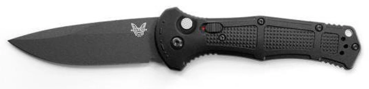 The Benchmade 9070BK Black Claymore Drop-Point Push-Button Automatic Knife is constructed with an automatic push-button and an integrated safety, which prevents unintentional blade deployment. Its Grivory handle scales are weatherproof and offer a secure grip. A tip-up, reversible, deep carry pocket clip tops off this design.