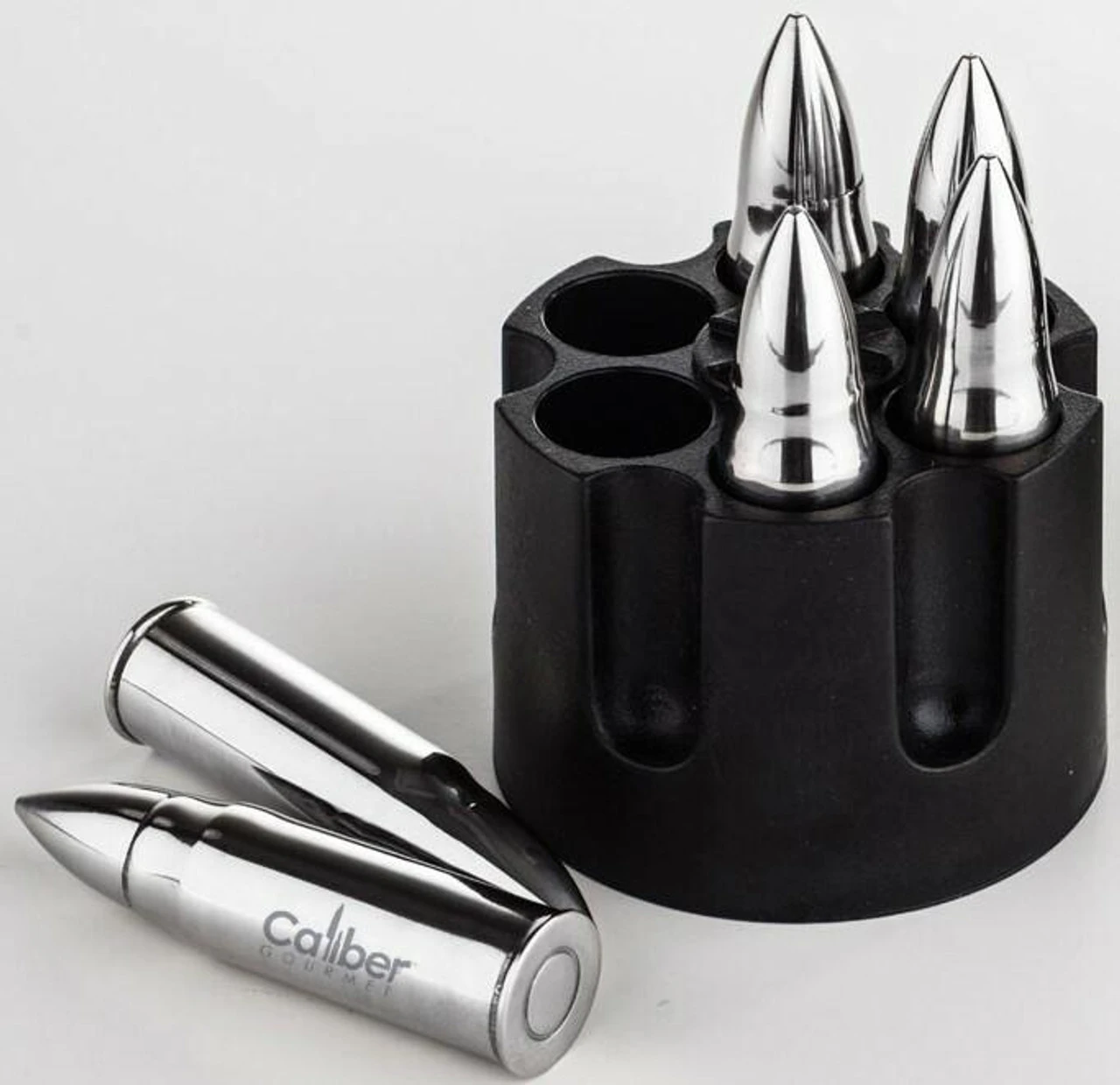 The Caliber Gourmet Stainless Steel Bullet Chillers keep your favorite beverages and cocktails frosty cold, without the use of ice. Each bullet is constructed with 304 stainless steel and is guaranteed to be food safe, while remaining free of rust and other contaminates, as well as foreign smells and tastes. Each bullet measures 12mm x 45mm and weighs in at only 11 grams. The 6 bullets are held in a revolver base that fits perfectly in the freezer to keep them cold and ready. These bullets are sure to make a big impression, and serve as the perfect gift for the firearm enthusiast.
