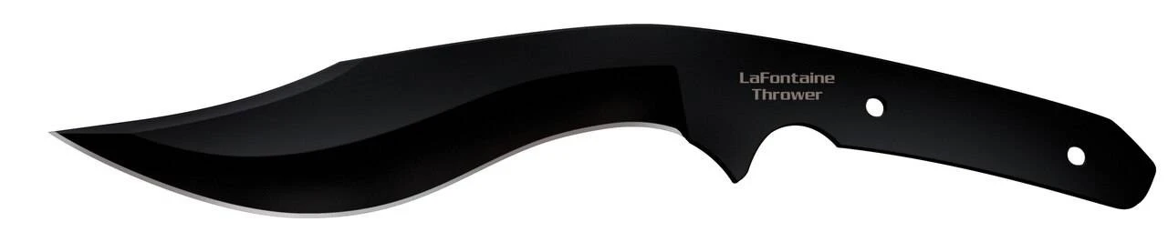 The Cold Steel La Fontaine Thrower Knife is heavily curved, with a wide belly, sharp cutting edge and an acute tip, topped off with an unsharpened false edge to compliment. With an purpose filled finger guard to stop your hand from sliding onto the sharp edge, and a tapered easy-release handle for throwing, the LaFontaine Thrower is a capable cutting and slashing blade as well as an excellent throwing knife.