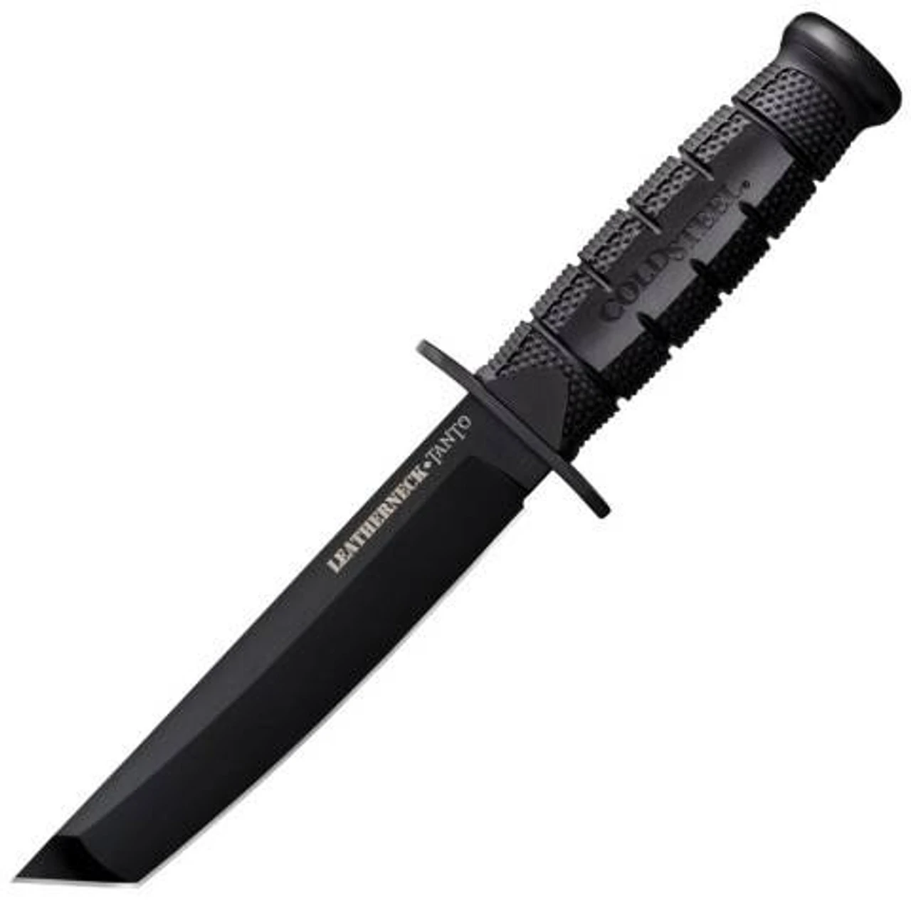 The Cold Steel Leatherneck Tanto is a blend two iconic blade designs that have proven themselves to be exceptionally popular in the armed forces. Built with a hand honed saber ground clip point blade and “American Tanto” blade with a stout, reinforced tip. The Leatherneck uses tough D2 Tool Steel with non-reflective black powder coat finish and solid steel double quillon guard to protect your fingers. The deeply checkered Kray-Ex handle provides excellent purchase and control of the extra-wide full tang blade.