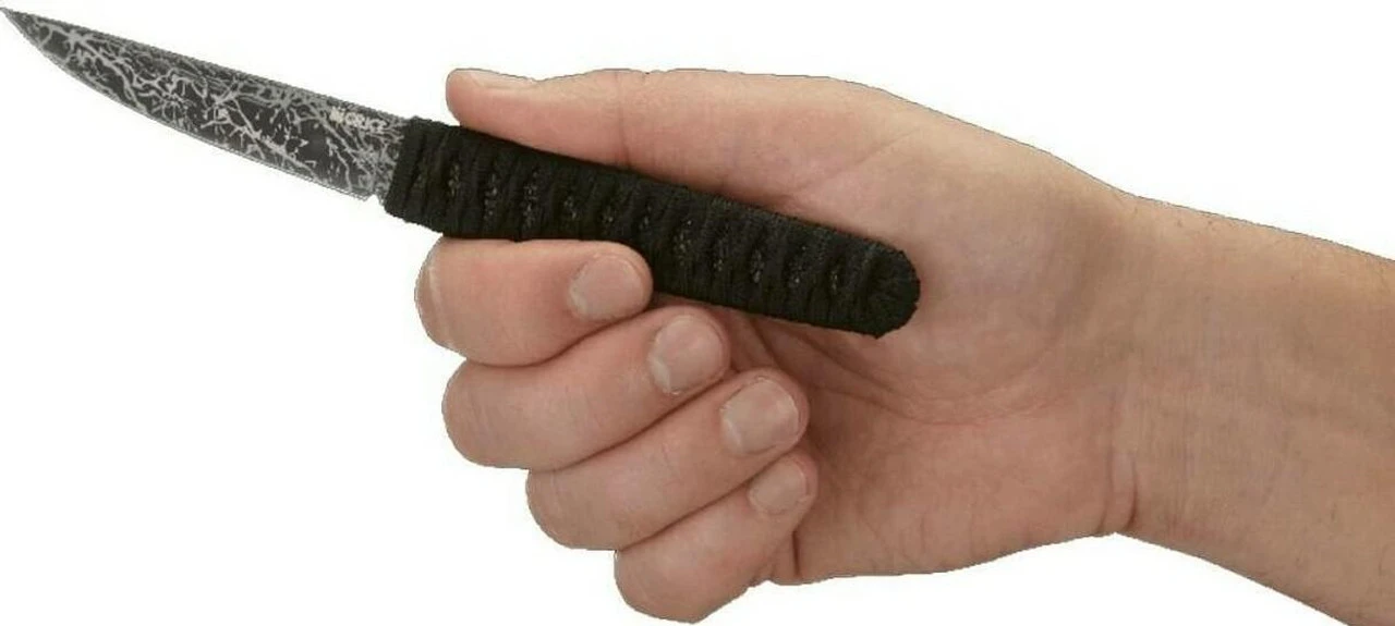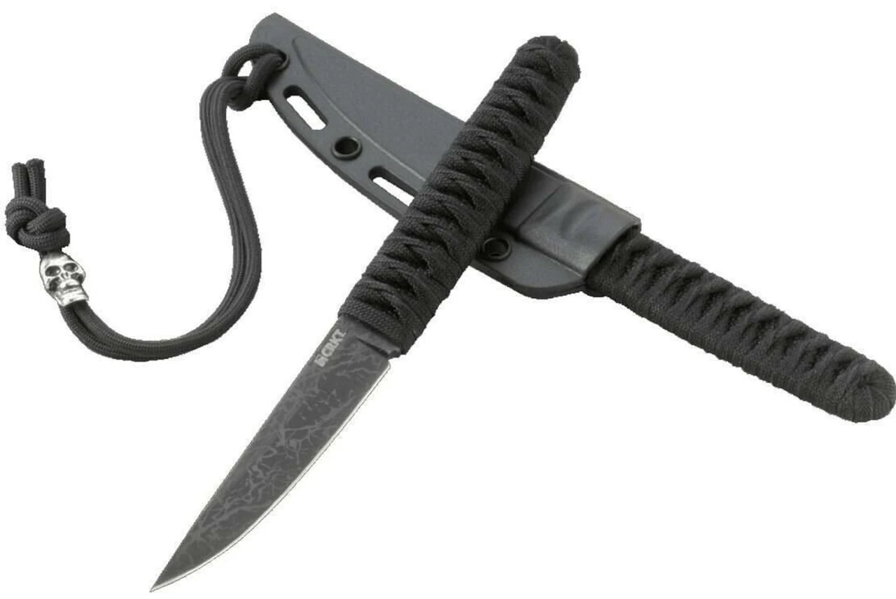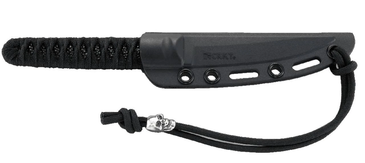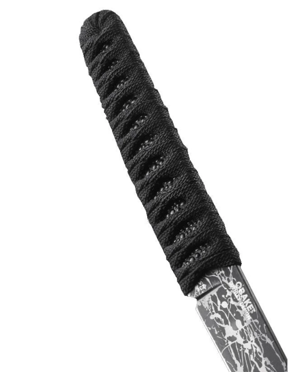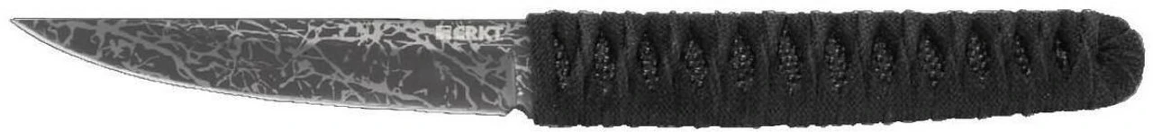 The CRKT Obake Knife features a uniquely etched blade and cord wrapped ray-skin style handle for a classical knife style built with modern-day materials and techniques. This knife is a tribute to a classic Japanese Kwaiken design, featuring a full tang fixed blade with a unique gray titanium nitride finish that’s acid-etched to make each knife unique. The sheath of the Obake is made from glass-reinforced nylon that provides consistent retention even in humid environments. A paracord lanyard on the sheath is designed to attach to your belt loop and keep the sheath in place when you deploy the knife. A skull bead adds a not-so-subtle accent to the paracord lanyard. The handle features a Katana style nylon cord wrap over a black faux ray-skin for an exceptional and secure all-weather grip.