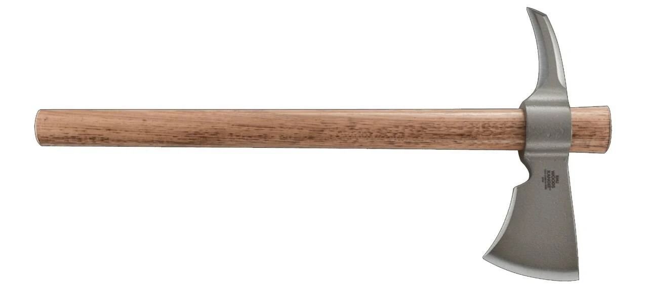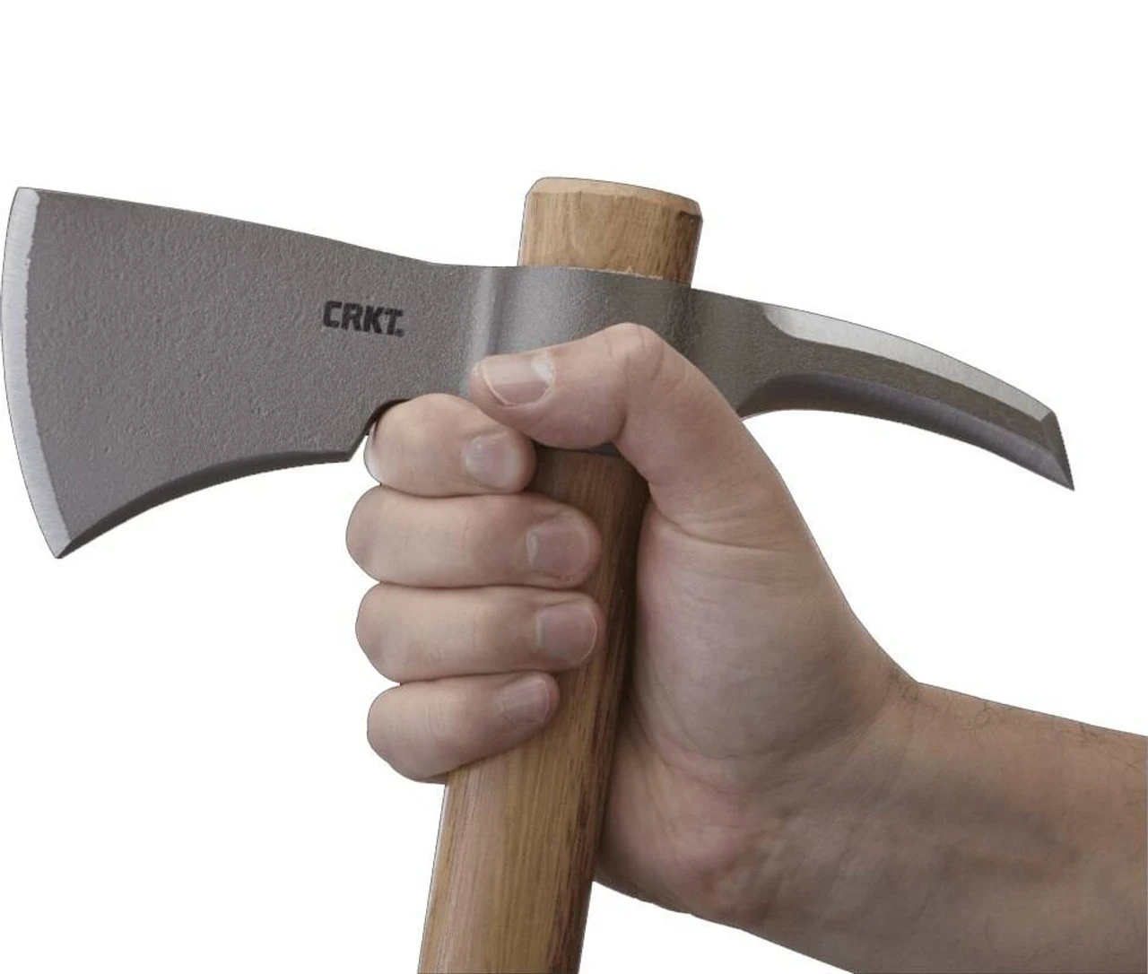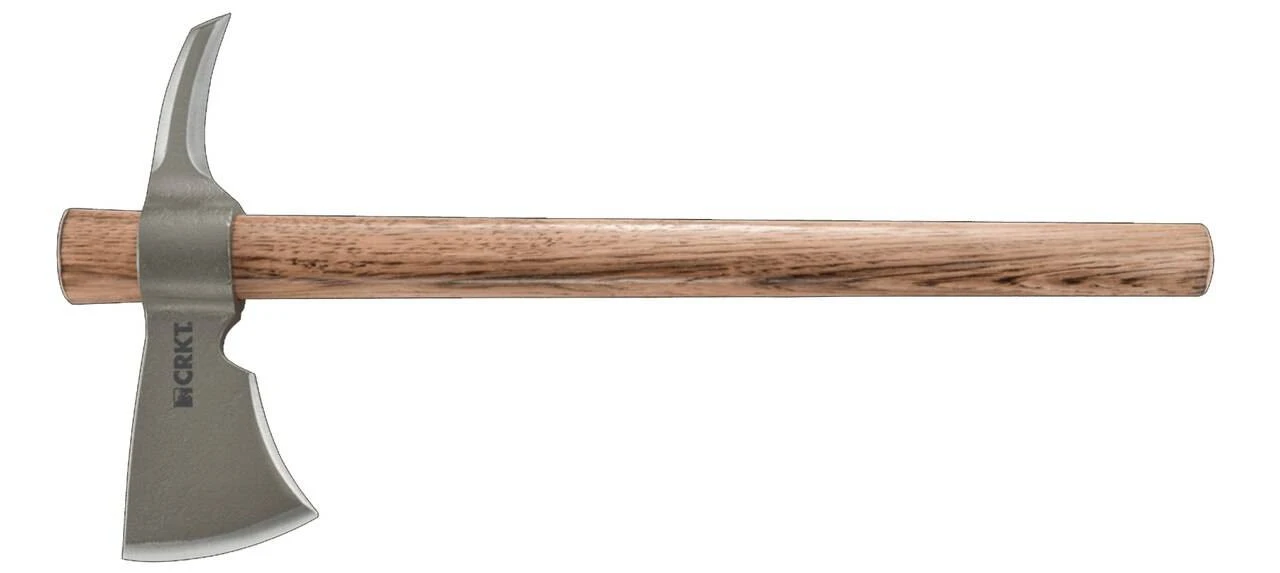 The CRKT Woods Kangee Tomahawk is a two-handed camp axe with a hickory handle, hot forged blade, and spike end will make your life easier when you’re off the grid. This Woods Kangee Tomahawk is made from a block of 1055 carbon steel that is hot forged into a rock-solid head and is hammered to finish. With primary and secondary edge bevels that are flat ground, it cuts through timber like a beaver. A spike on the opposite end splits ultra-tough wood knots like a piece of tissue paper. The thick wood handle is made in the USA from Tennessee hickory. It’s comfortable in hand and sealed with a lacquer coat that adds durability