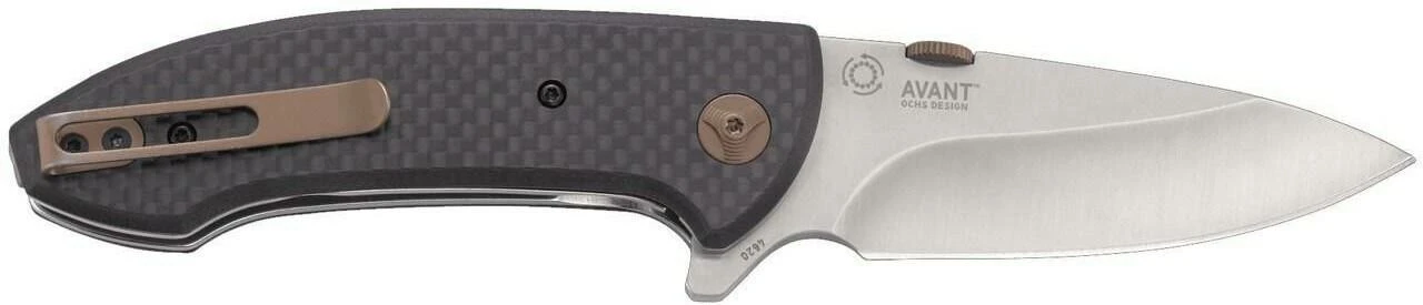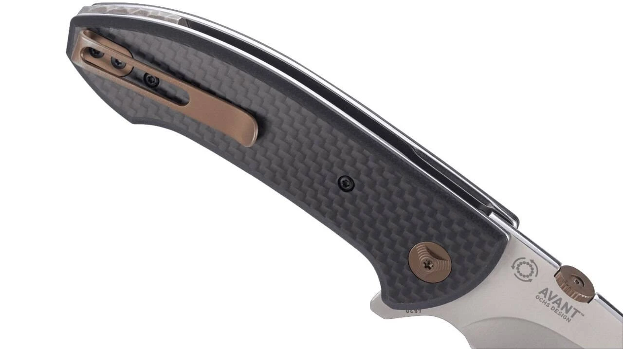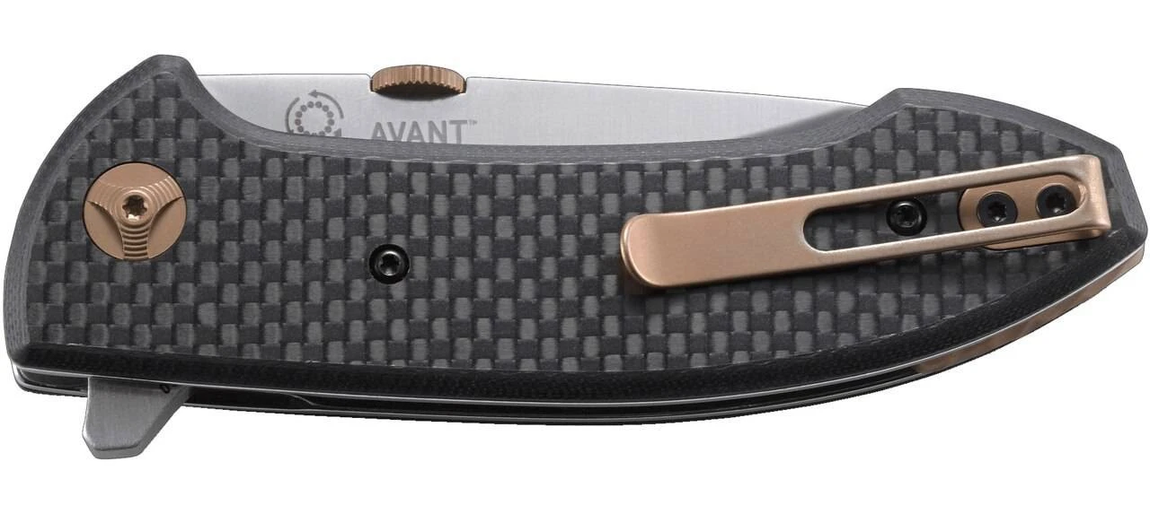 The CRKT Avant Spear Point Folding Knife is an everyday carry folding knife that features clean lines, subtle bronze details, and highly-ergonomic build. The flipper opening and the fast, smooth IKBS uses lubed ball bearings in the pivot to deploy the blade at lightning speed with a thumb disk for a manual open. Once deployed, the locking liner adds a solid layer of safety without compromising on one-handed closing capability. The woven carbon fiber handles are compact and solid in the hand and the practical satin-finished spear point blade thrives from the front country to the back. To polish the look, Ochs gave it a bronze pocket clip and pivot detail, earning it serious style points.