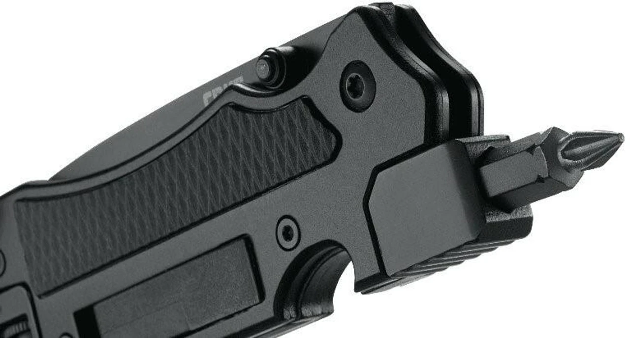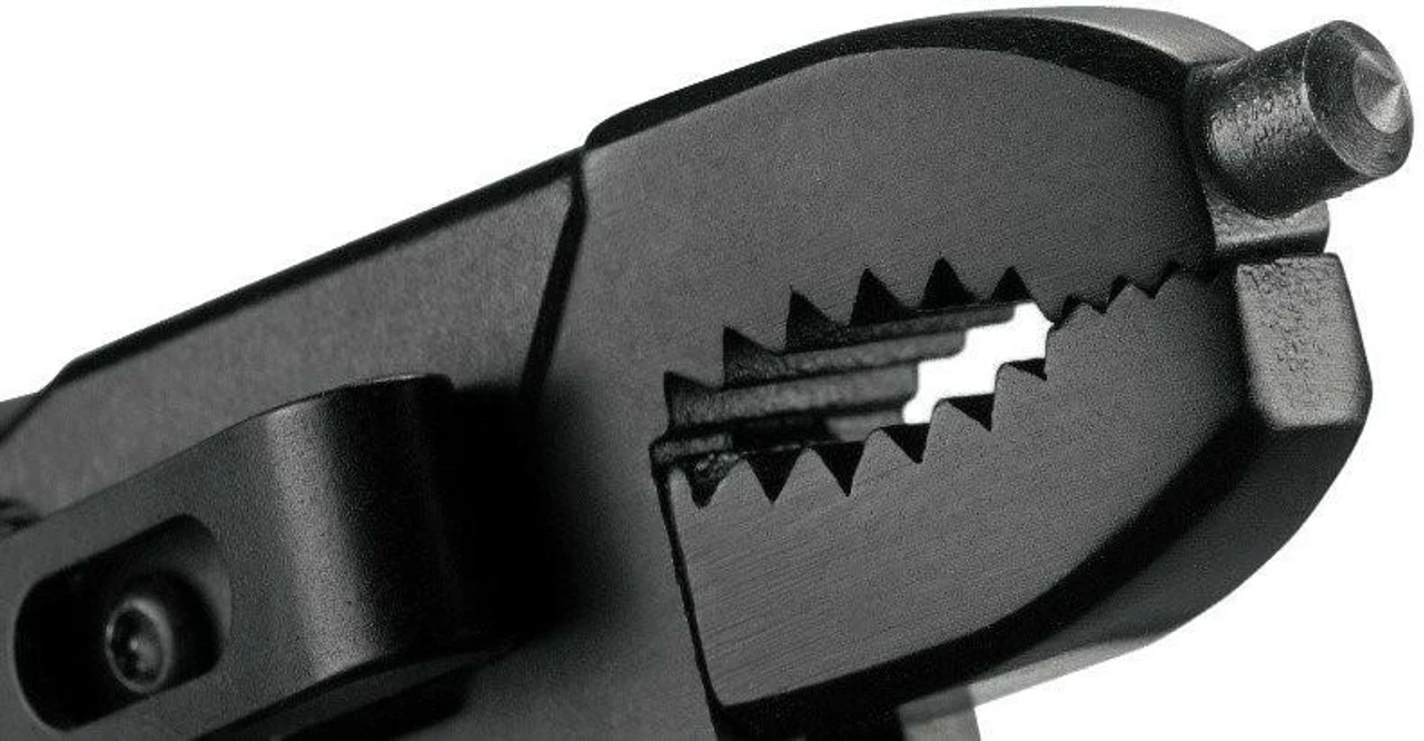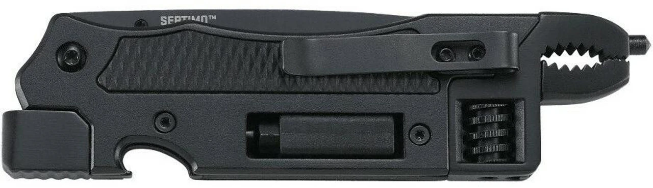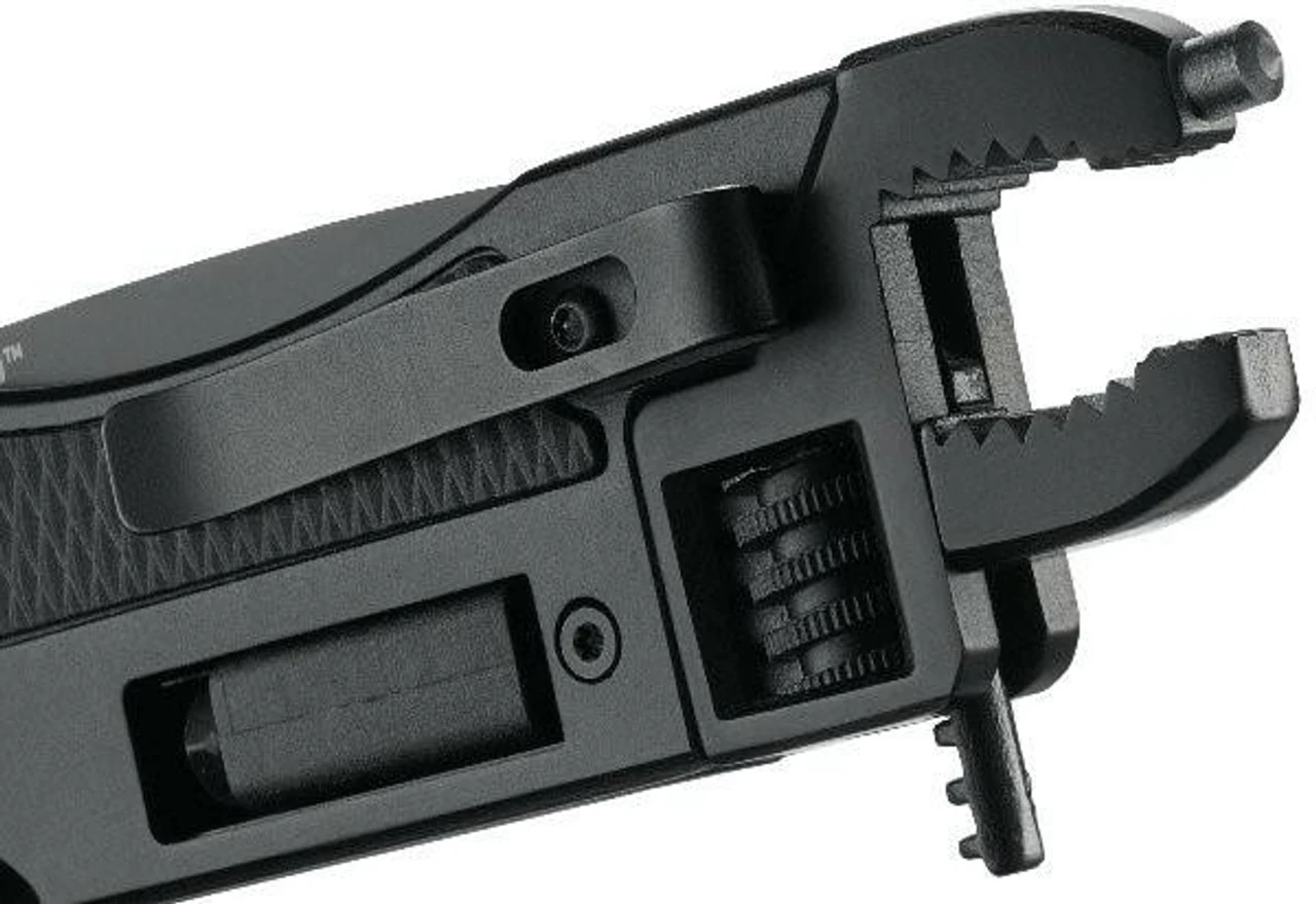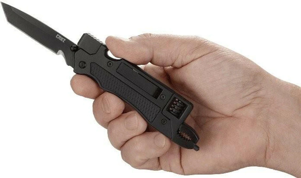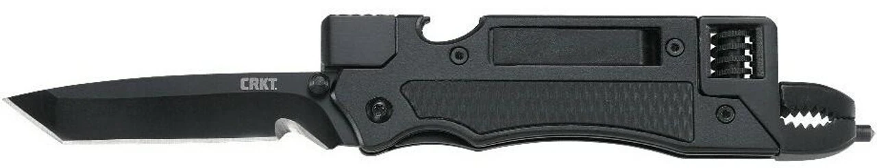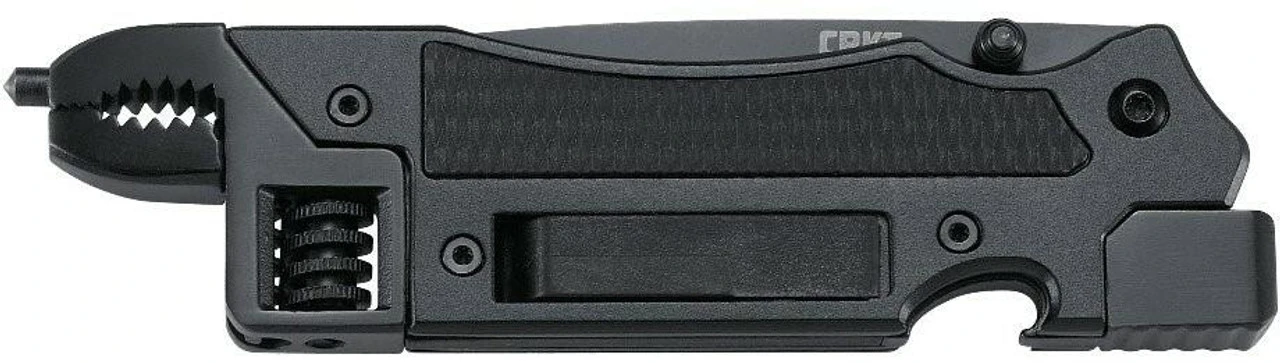 The CRKT Septimo Multi-Tool is a tactical to everyday carry crossover designed by a seasoned Green Beret to be more than a convenience with a tanto blade with one Veff Serration for exceptional strap cutting ability, a Philips and flathead screwdriver, bottle opener, glass breaker, and adjustable wrench for a deployment-prepared powerhouse. This multitool features a thumb stud opening, desert-proof black oxide finish and friction points on the handle to help deal with inclement conditions.