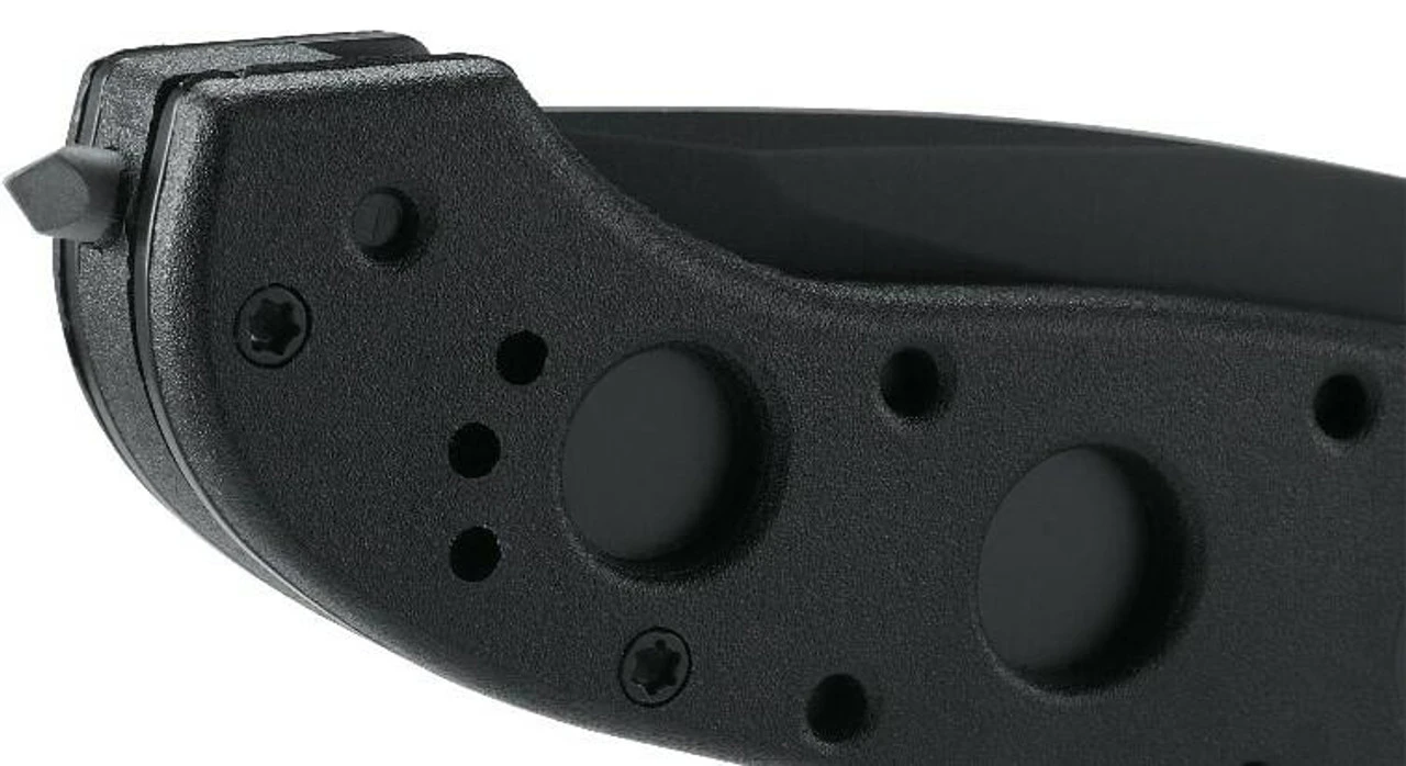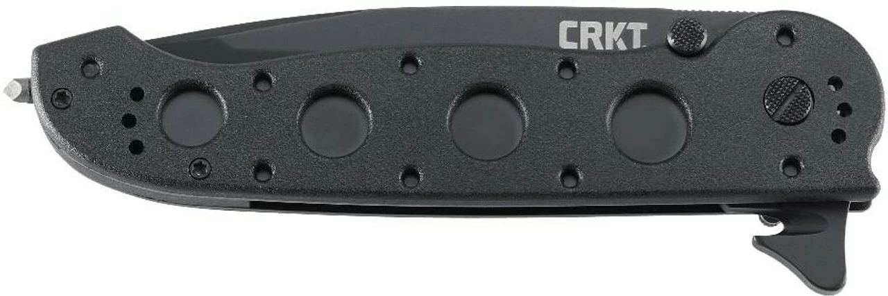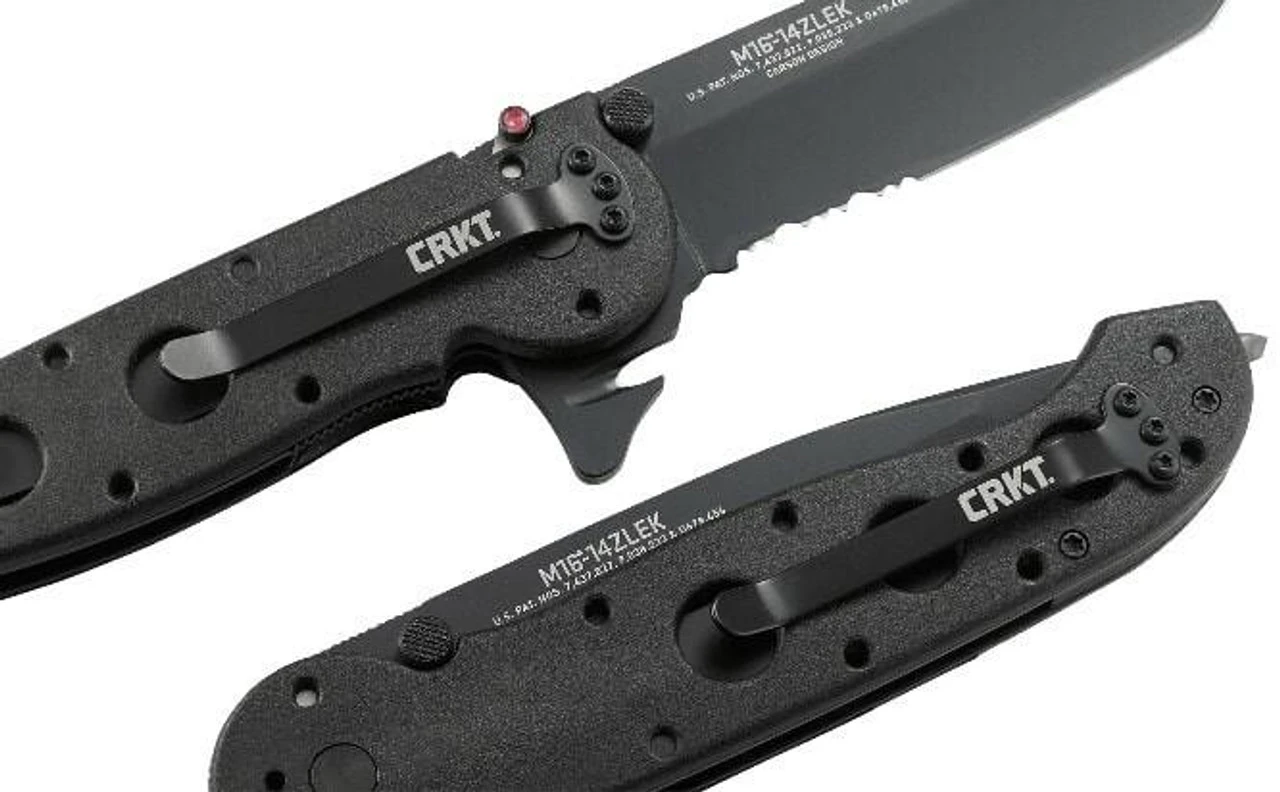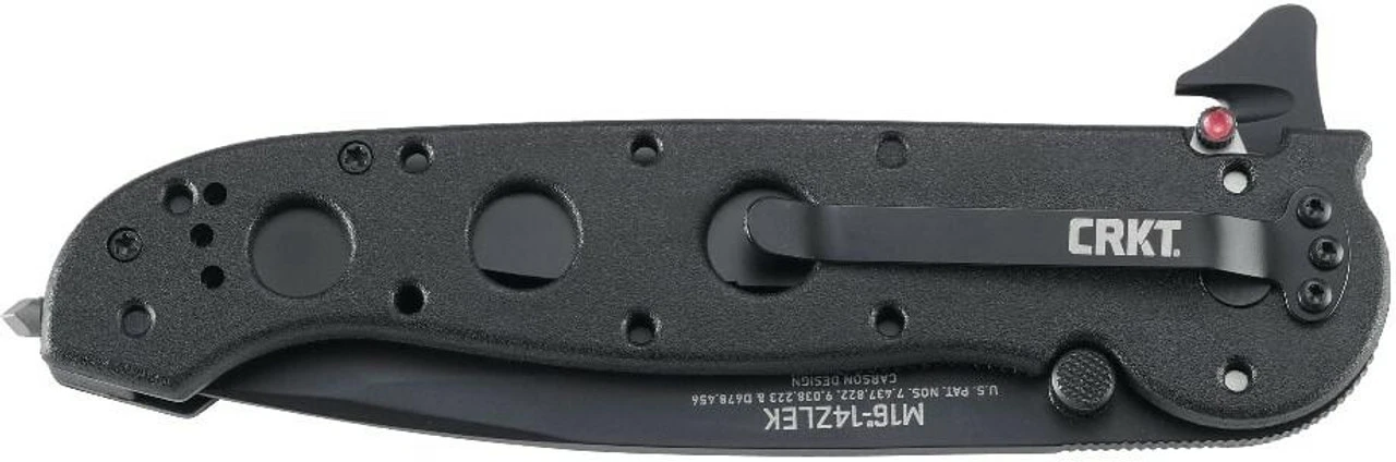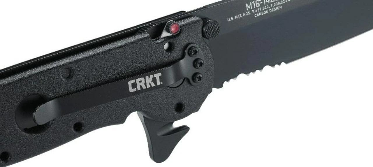 The CRKT M16 Tanto Blade Knife features an InterFrame construction, with tough, textured glass filled nylon scales over a 420J2 stainless steel liner InterFrame and solid glass filled nylon back spacers. The Flipper can be pressed for fast one-hand opening and creates a blade guard when open. At the butt of the knife is a seat belt cutter to the Carson Flipper, and a tungsten carbide window breaker that shatters automobile side windows with one quick whack from the butt of the knife. The premium AUS 8 high-carbon stainless steel for the blades, which have Combined Razor-Sharp and Triple-Point Serrated edges to easily cut rope, cord, canvas, and vegetation. The automated liner safety sets a pin between the locking liner and the frame for an additional layer of safety, so the locking liner is less likely to disengage during use. To close the knife, pull the red buttoned safety lever back, slide the locking liner over, and fold the blade into the closed position.