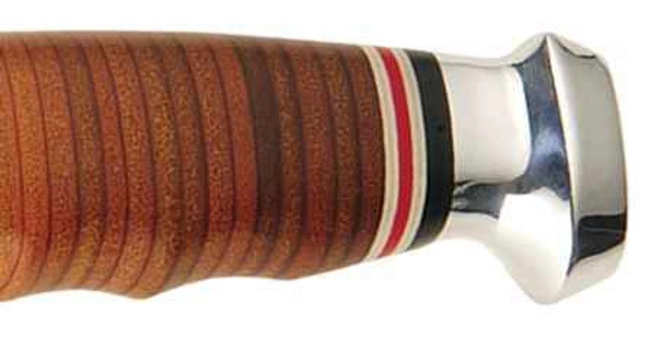 Clasically styled leather-handled hunting knives have been popular since the early 1900s. Dressy enough for gift giving and practical for field use. Brown leather KA-BAR sheath included.