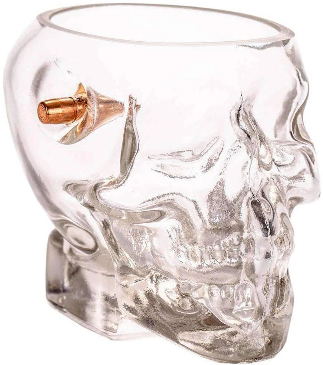 The Lucky Shot .308 Projectile Bullet Skull Whiskey Glass is an 11 oz molded skull whiskey glass embedded with a genuine, lead-free .308 bullet. These bullets are made without lead and have no powder residue on them, so they are perfectly safe to drink from.