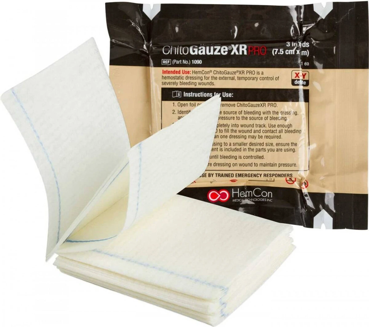 The North American Rescue Chitogauze XR PRO 30-0049 is a innovative hemostatic dressing for external, temporary control of severe bleeding wounds. Composed of a polyester/rayon blend non-woven medical gauze that is coated with chitosan. There is a x-ray detectable strip embedded which is Z-folded and packaged in a vacuum sealed pouch that is compact and rugged.