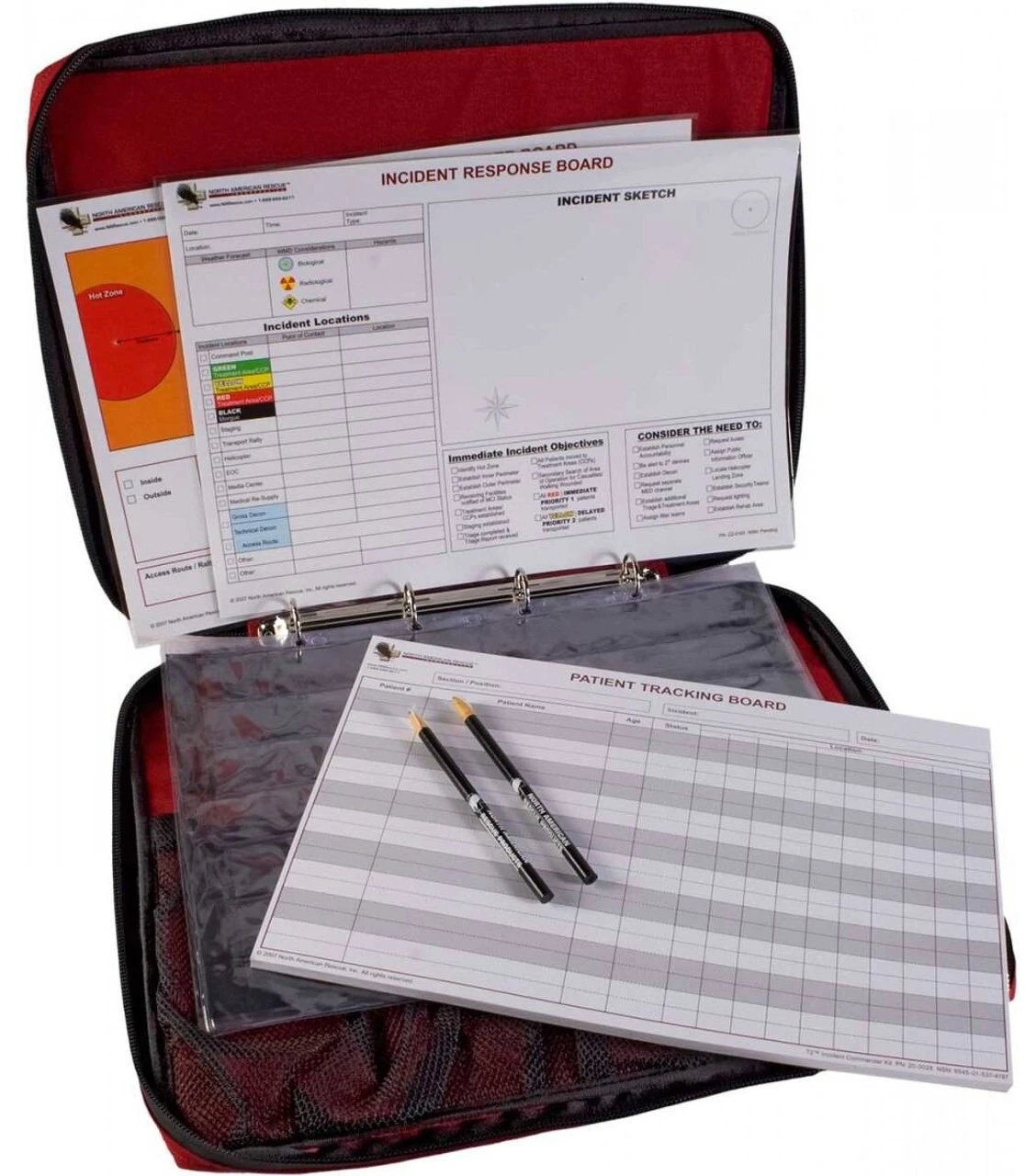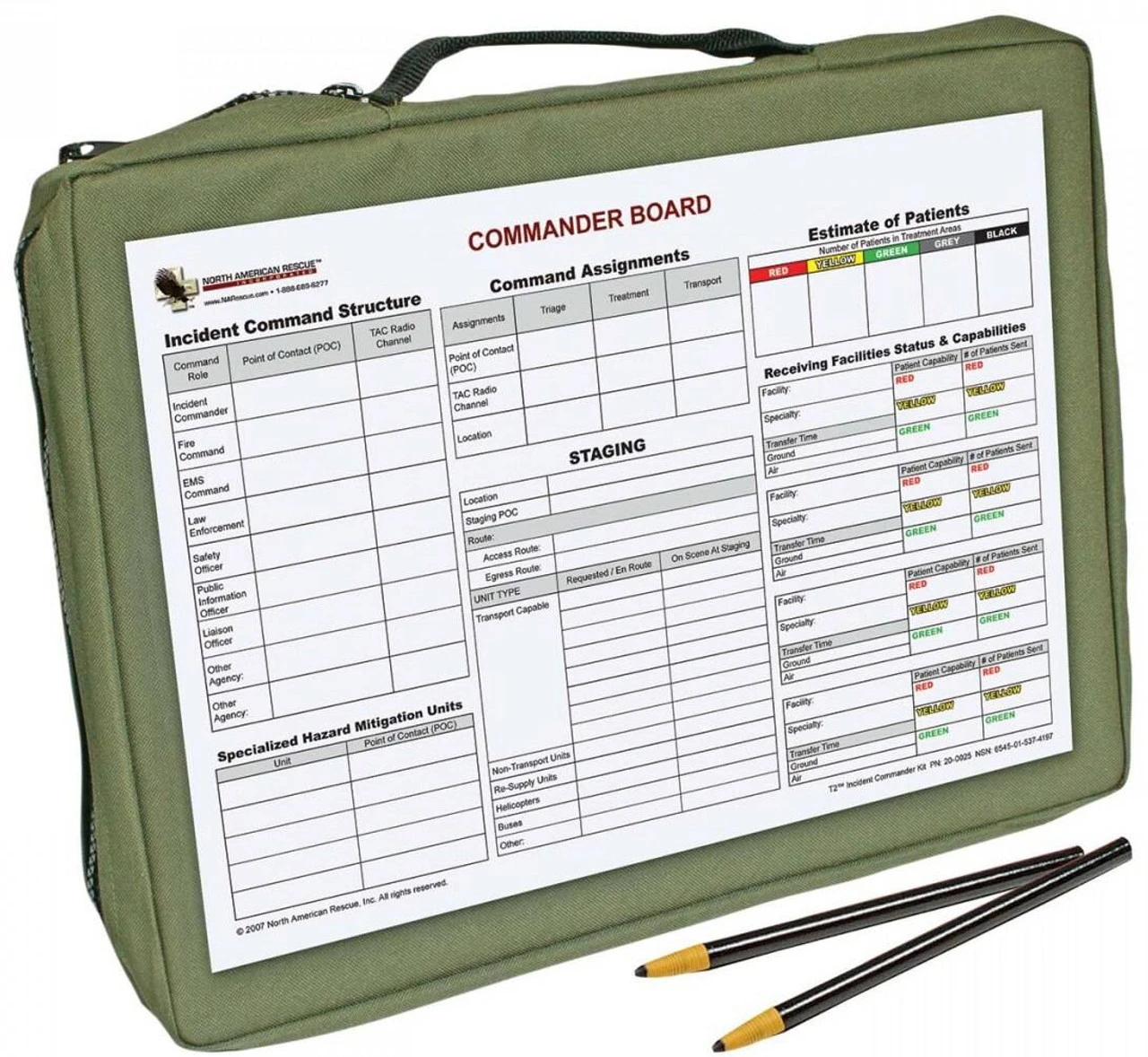 The North American Rescue T2 Command Kit enables the user to establish an organized disaster-response system quickly and efficiently. The kit includes items such as a laminated and detachable T2 Commander, T2 Incident-Response, and T2 Blast/WMD Scene-Command Boards for organizing and tracking groups of casualties, plus a pad of 50 T2 Patient Tracking Boards for documenting individual patients. The self-contained kit also has 2 bar-code storage sheets, 3 clear storage pouches, and 2 black grease pencils.