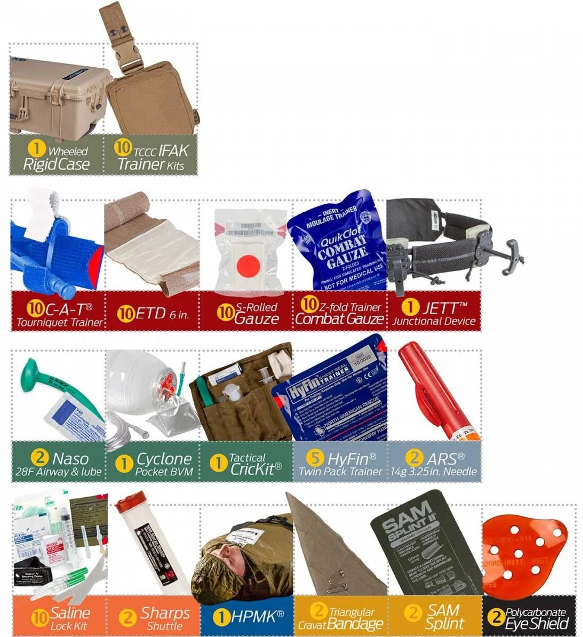 - Contains 10 pre-packed TCCC Training IFAKs for use by students during trauma lanes or training scenarios