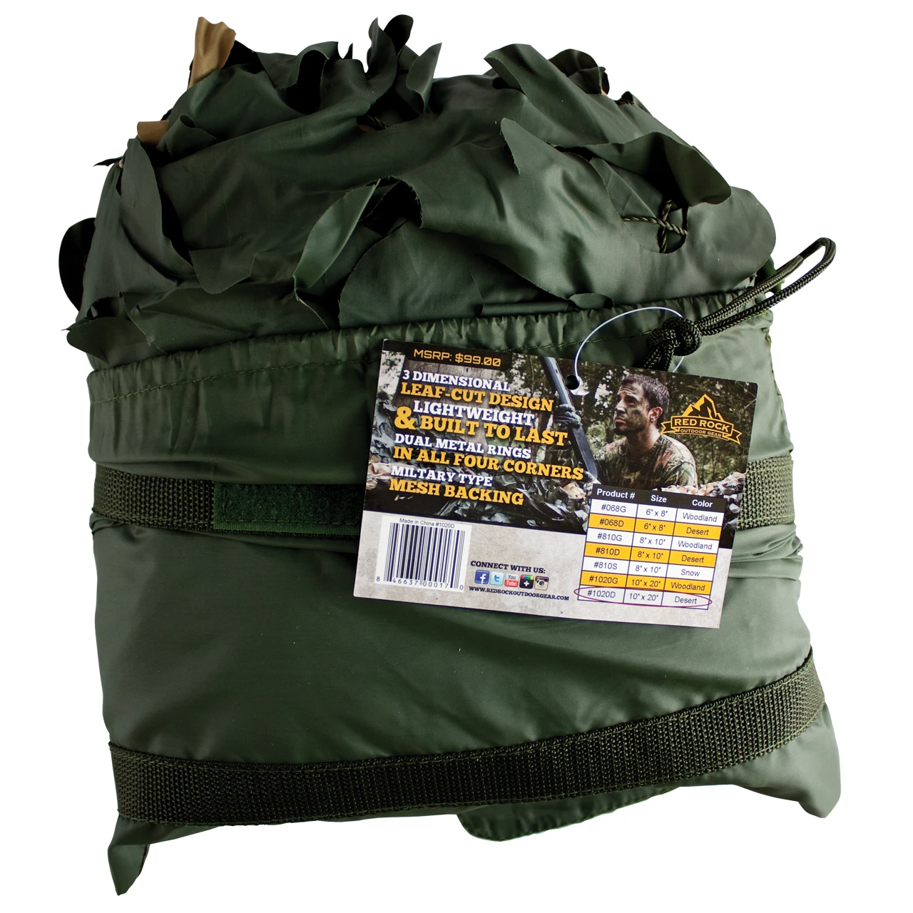The Red Rock Camouflage Hunting Series Netting is a lightweight and versatile camouflage netting with a military-style mesh backing with reinforced edges for an easy to carry and deploy net that is built to last. A stuff sack is included for storage and transportation. The three-dimensional leaf-cut design provides superior concealment with a full, natural look. The two metal rings sewn into each corner make hanging and securing this net a simple task.