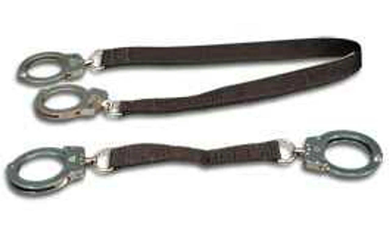 Smith & Wesson Model 100 handcuffs permanently attached to doubled 1″ wide, 700 lb polypropylene belting.