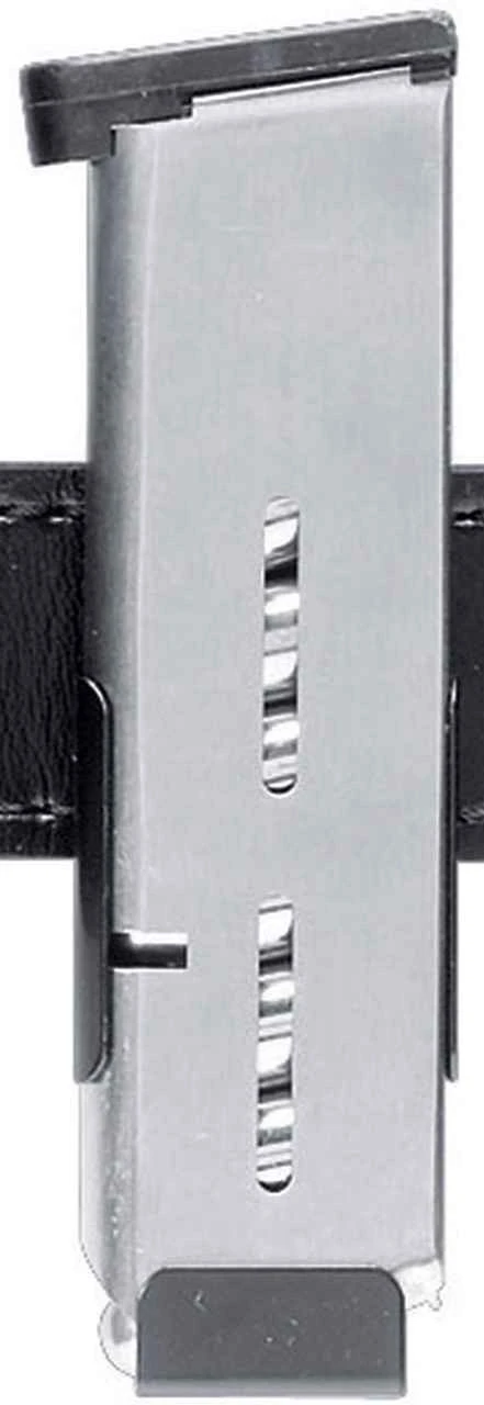 The CD-Auto metal Clip-On magazine holder is ideal for plainclothes, off duty, or private use. This epoxy coated holder carries one magazine in a butt up mid ride position. A simple side motion releases the magazine and provides instant access. Available in a black finish.