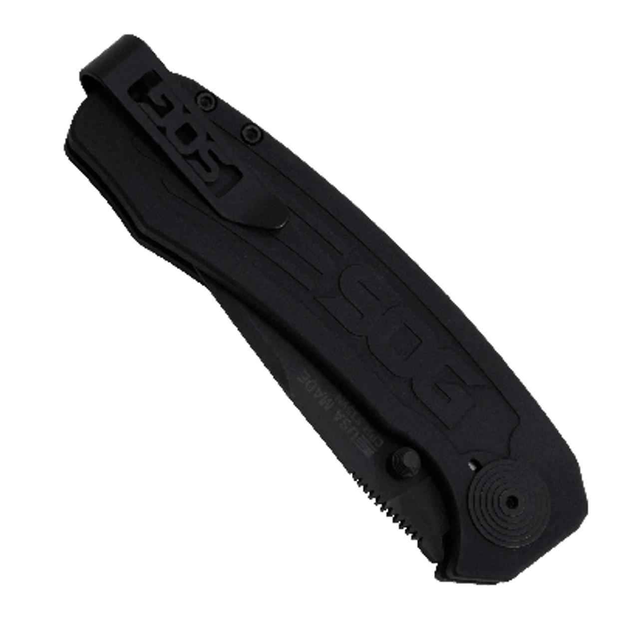 The SOG Banner USA MADE Folding Knife is based around superior CPM S35VN steel that offers improved toughness, better edge retention, higher resistance to wear and edge chipping while maintaining a sharp edge. The Tac Ops is a fully-equipped, heavy-duty folder with an automatic opening CPM S35VN blade with a black Cerakote coating housed in a linen Micarta handle with stainless steel liners. Even with a 3.5-inch blade it is a mere 4.5 ounces with a durable and slim profile that is quick to deploy. The blade opens with the push of a button and lock with a reassuring “click”. The linen Micarta gives this knife a superior grip in wet or dry conditions that looks better the more it is used. The handle contours to your grip for maximum comfort. All these features combine with a thin profile and a reversible low-carry pocket clip making this the perfect everyday carry knife. For questions on legality, consult your local, county, & state laws.