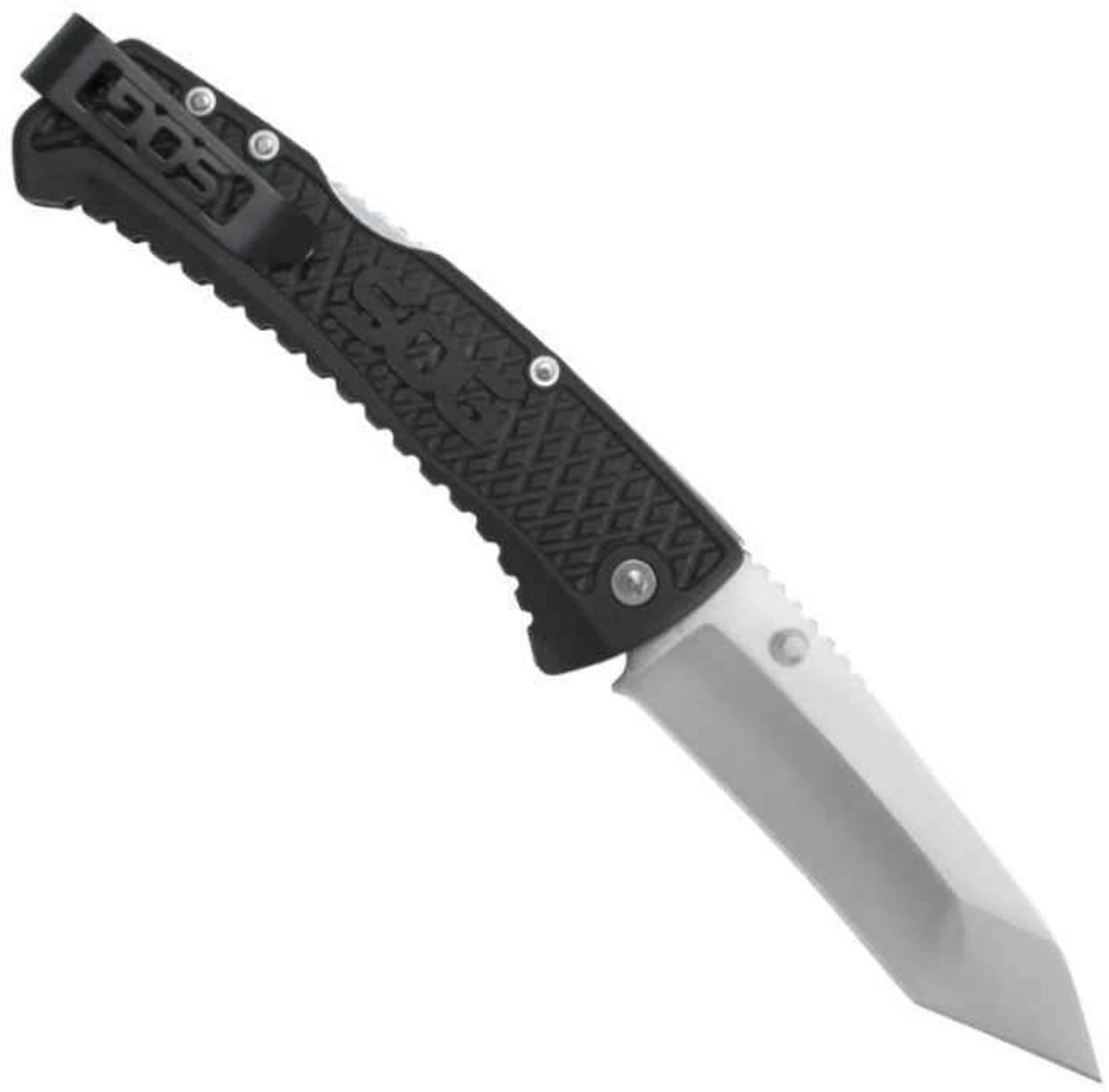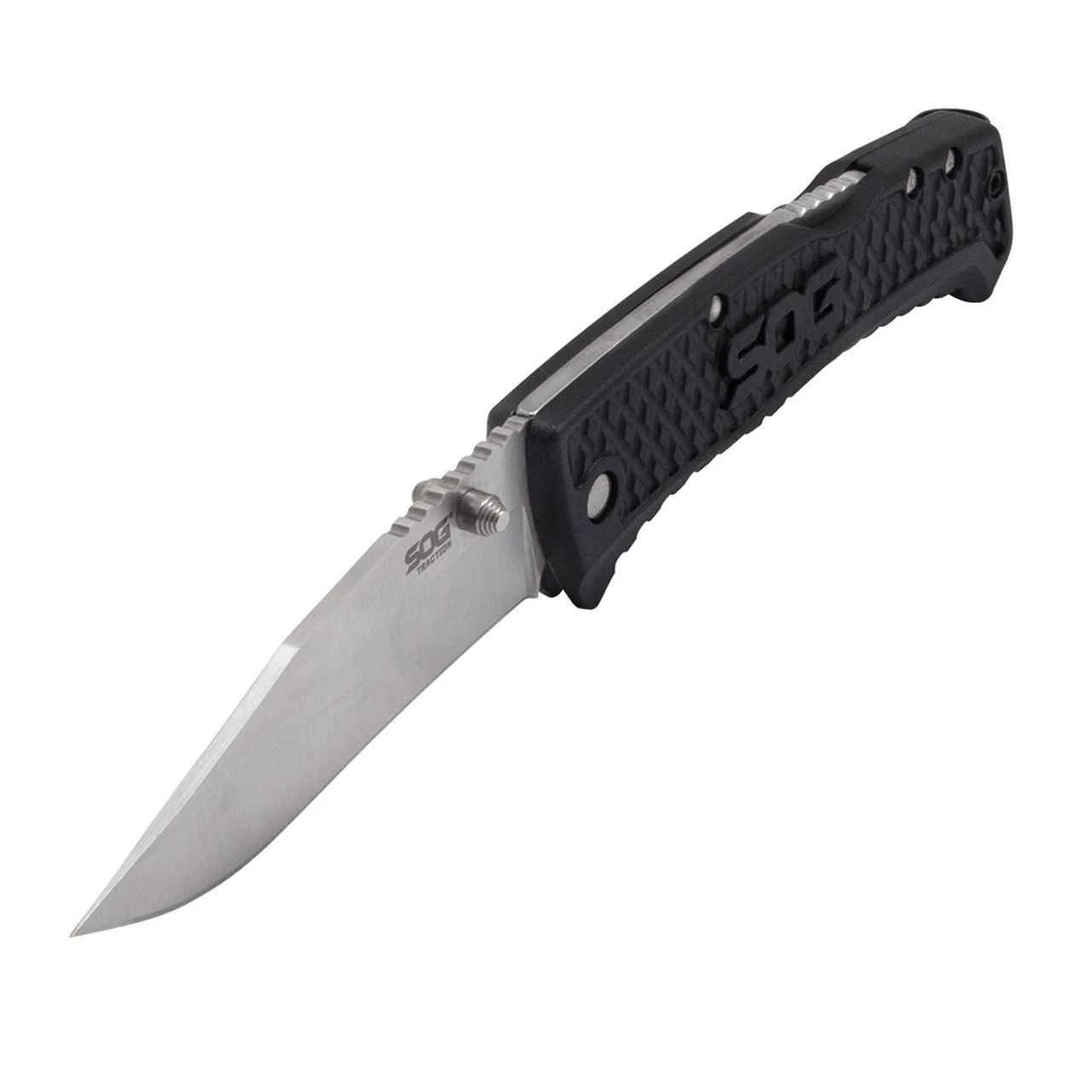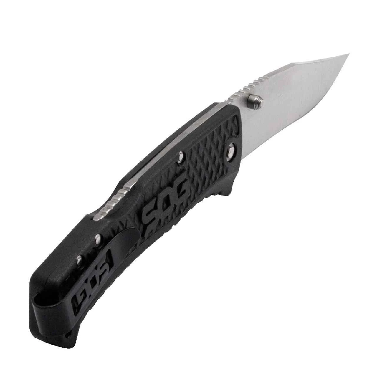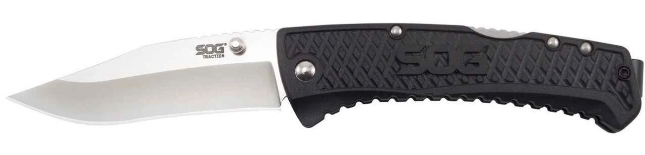 The SOG Traction is an all-purpose line of solid lockbacks that are lightweight, durable, reliable and affordable. Available in a satin clip point or tanto blade shape. The straight edge 5Cr13MoV stainless steel blade is dependable, sharp, and cuts easily and quickly. It locks open with the proven lockback mechanism to prevent accidental closure while in use. All housed in a thick, strong glass-reinforced nylon (GRN) handle that is contoured and textured to enhance grip and comfort. A low-carry pocket clip make it an easy daily carry option.