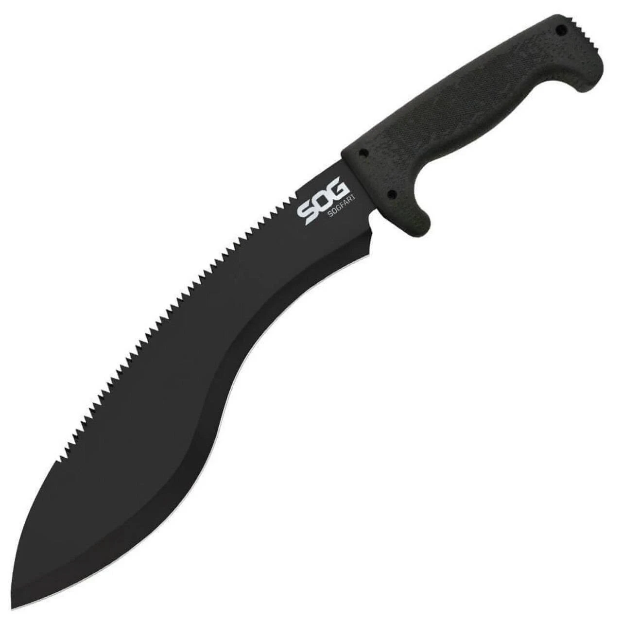 The SOG Kukri Machete features a 12.88-inch 3Cr13 black Cutlass blade with double ground teeth that cut deep and a real working saw on the back. Extended out of the back of the rubber handle is a spiked tang for pounding and scraping and holes in the handle to mount lanyards. The Kukri Machete is the go to tool for survival, exploration and adventure.