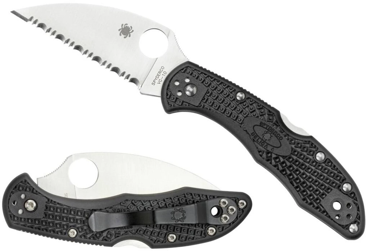 The Spyderco Delica 4 Lightweight Wharncliffe Folding Knife features a “Wharncliffe” blade profile, which is unique in it’s perfectly straight cutting edge and a spine that tapers to meet that edge at an acute point. This knife can cut with both scalpel-like precision and power outclassed by it’s on design. The Delica Wharncliffe features a full-flat-ground VG-10 stainless steel blade with a fully accessible Trademark Round Hole that supports one-hand opening with either hand. It is paired with the time-tested Delica Lightweight handle design, which includes a sturdy back lock mechanism, skeletonized stainless steel liners, and a four-position pocket clip that allows both left and right-side tip-up or tip-down carry.