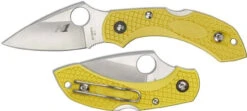 The Spyderco Dragonfly 2 Salt Lightweight Yellow Folding Knife utilizes a H-1 blade. Its blade-to-handle geometry and leveraging points fill a gripping hand, giving this knife a much larger feel. Its fiberglass reinforced nylon handle is molded with a grip pattern called Bi-Directional Texturing.