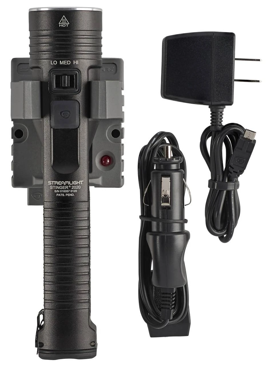 This Stinger 2020 flashlight comes with a 120V AC Charging Code, a 12V DC Charging Cord, and 1 Holder.