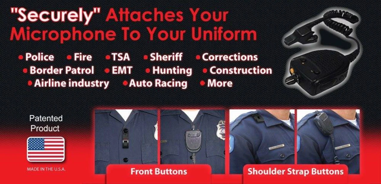 The TMK is a simple, yet reliable and professional solution to the microphone retention problem. It can be worn on the front of the uniform or under the shoulder strap (epaulette). Once in place, the TMK becomes invisible as it is hidden by the microphone. The TMK keeps your microphone safely in place and keeps your uniform professional in appearance as it attaches by way of the uniform button, not the uniform. When in use, the TMK disappears and all that is seen is your mic.