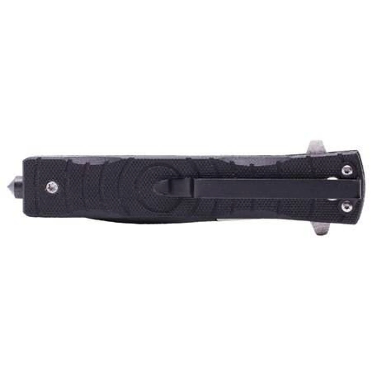 UZI Mossad III. 4 3/4″ closed linerlock. 3 1/2″ black and silver finish, assisted opening, stainless dagger blade with slot cutouts and extended tang. Black composition handles with glass breaker tip. Black stainless pocket clip.